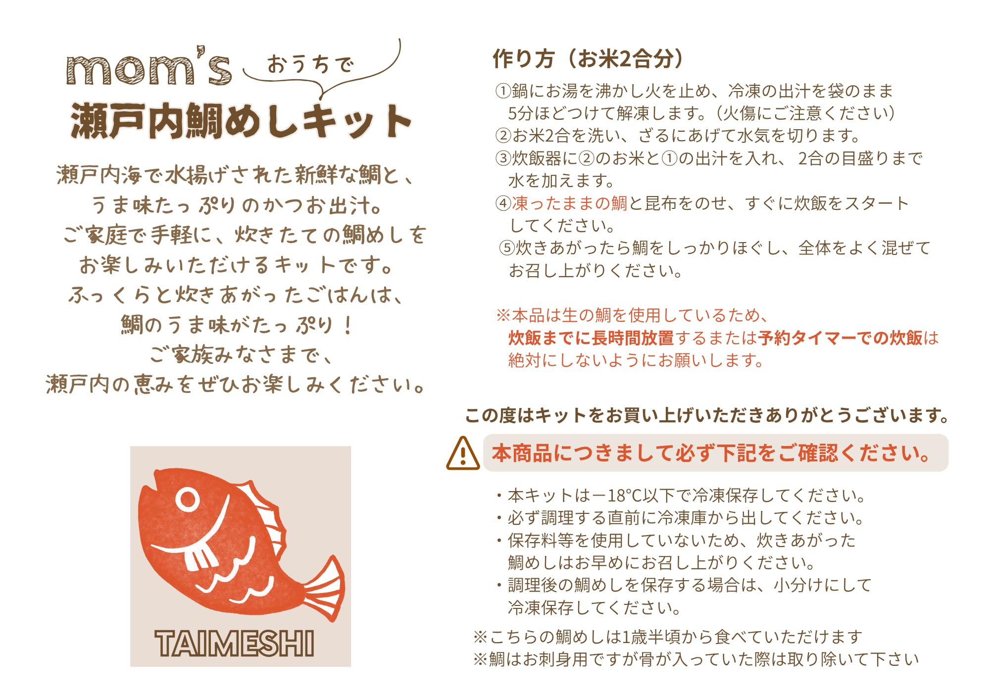 ・調理後の鯛めしを保存する場合は、小分けにして冷凍保存してください。